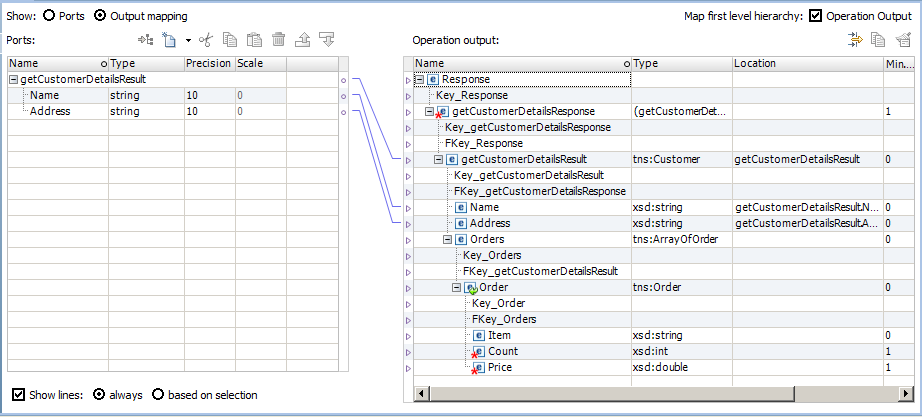 The following figure shows a mapping between the input ports and the SOAP message nodes in a web service Output transformation: