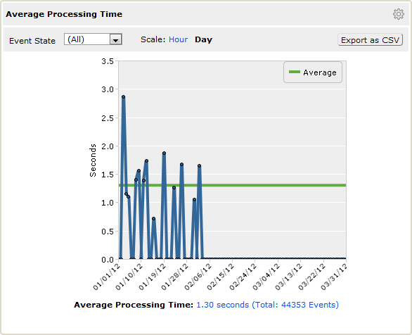 Average Processing Time | Average processing time for events that B2B Data Exchange generated each day or hour and the total number of events for the selected time frame. You can click the link to display the events in the Event List page. |