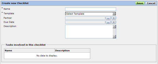 Partner | The partner being on-boarded. When on-boarding a new partner, you can create the checklist before creating the partner and then create the partner as a part of the checklist. After creating the partner, enter the partner details in this field. When on-boarding an existing partner, enter the partner details when creating the checklist. |