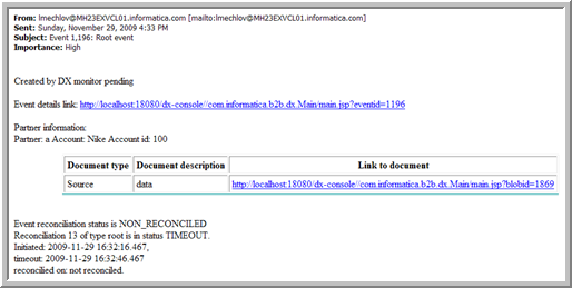 General information. The message includes details such as the monitor that sent the message, partner and account details, and a link to the event. If you are logged on to the B2B Data Exchange console, clicking on the link displays event details.