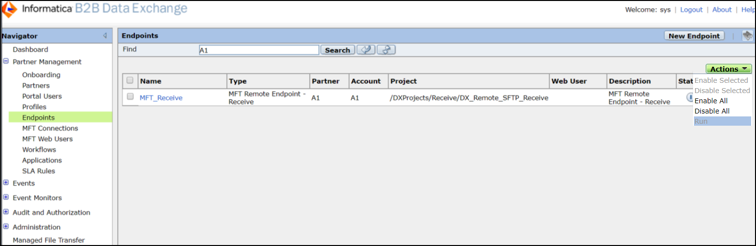 All endpoints that are selected is enabled. The Status of each endpoint that is enabled displays as