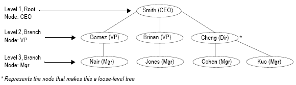 Level one contains CEO information. Level two contains information about vice presidents. Level three contains information about managers. However, in this example, one node in level two refers to a data column that contains information about directors, not information about vice presidents.