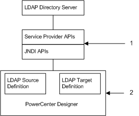 The Designer starts a session (binding) with the LDAP directory server to import source and target definitions using the JNDI or Service Provider APIs (also called as the Service Provider Interface (SPI)).