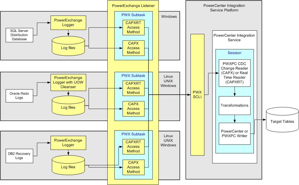 In this real-time configuration, PowerExchange CDC uses the CAPXRT access method to capture change data from a SQL Server distribution database, Db2 database logs, and Oracle redo logs. When an extraction request runs, PowerCenter connects to the PowerExchange Call Level Interface (SCLI) to contact the PowerExchange Listener. The change data is passed to the SCLI and then to the PWXPC CDC Real Time reader. In this manner, the PowerCenter extraction session pulls the change data that PowerExchange captured. After the PWXPC reader reads the change data, PowerCenter uses the mapping and workflow that you created to transform the data and load it to the target. With this configuration, you can replicate change data from multiple sources in the same database or instance to multiple target tables in a single extraction process.