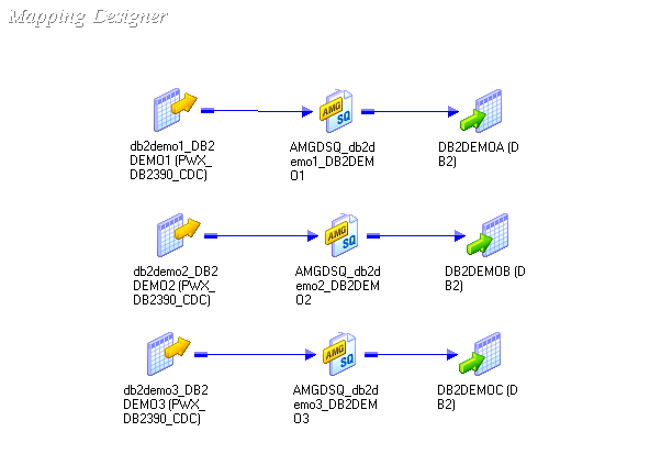 The following figure shows an example mapping in PowerCenter Designer with three DB2 sources: