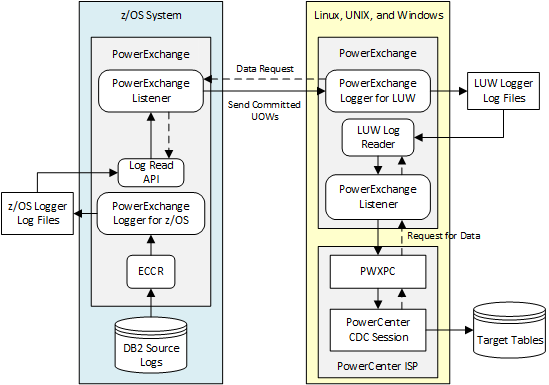 The PowerExchange Logger for Linux, UNIX, and Windows sends a request for change data to the PowerExchange Listener on z/OS. This PowerExchange Listener contacts the Log Read API (LRAPI) to read captured change data from the PowerExchange Logger for z/OS log files. The PowerExchange Listener on z/OS transmits the change data in a single stream over the network to the PowerExchange Logger for Linux, UNIX, and Windows. The UOW Cleanser runs on the Powercenter ISP machine to cleanse the data, and then the PowerExchange Logger for Linux, UNIX, and Windows relogs the data in its local log files. When a Powercenter CDC session runs and requests change data for the tables of CDC interest, the PowerExchange Client for PowerCenter (PWXPC) requests change data from the PowerExchange Listener on the system with the Logger for LUW log files. The PowerExchange Listener contacts the local PowerExchange Logger Log Reader to read change data from the Logger log files. PWXPC makes the data available to the PowerCenter CDC session. Multiple PowerCenter CDC sessions can extract change data from the local PowerExchange Logger log files.