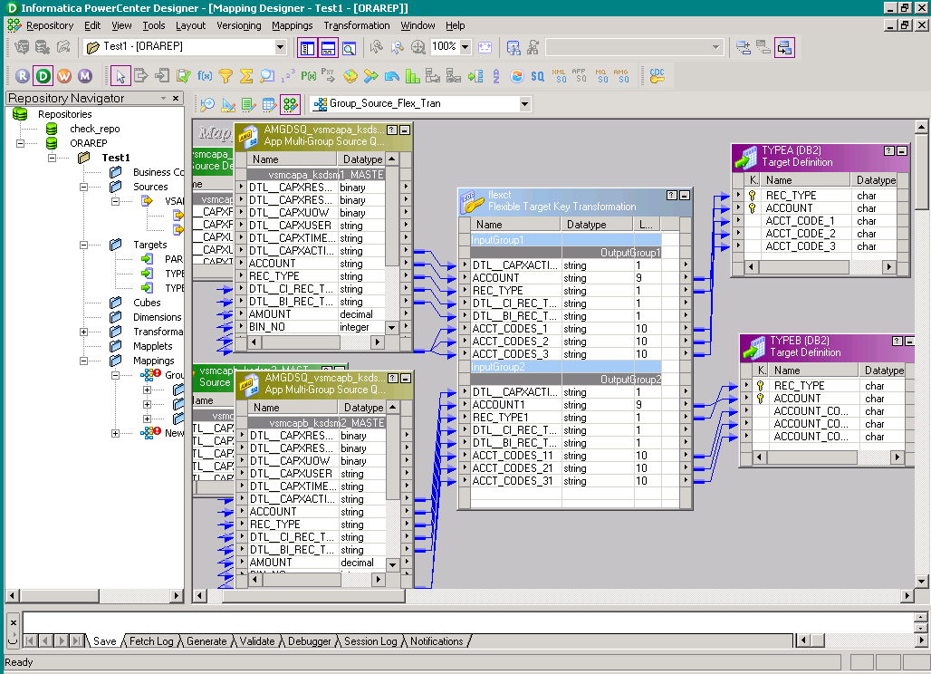 The Flexible Target Key transformation contains the columns for both of the PowerExchange sources, and those sources each link to their own target tables. The Flexible Target Key transaction includes input and output groups. An input and output group is added when the transformation is created.