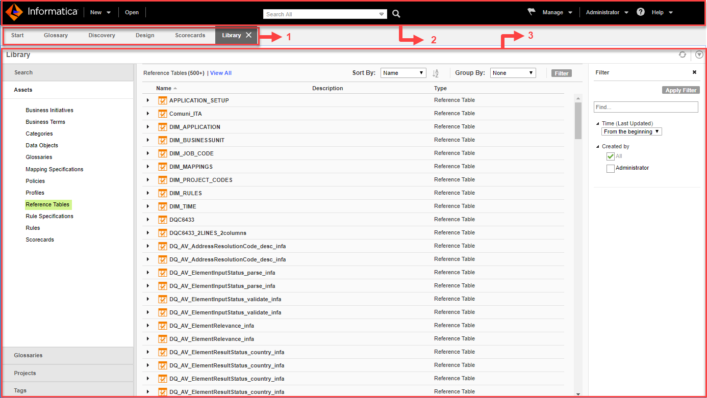 The Analyst tool user interface consists of multiple workspaces that you use to create data integration and
