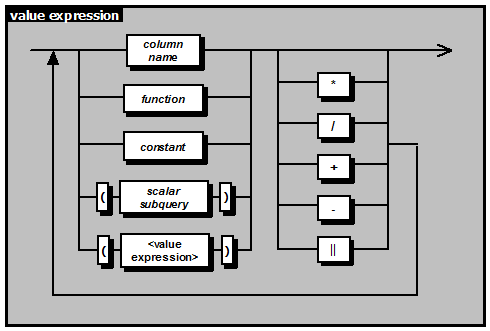The + (addition), - (subtraction), * (multiplication), and / (division) operators are used to construct arithmetic expressions. The || (concatenation) operator is used to append one string value expression to the end of another. An exception is that aggregate functions cannot be part of an arithmetic expression.
