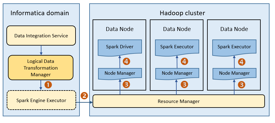 Sparkエンジンでマッピングを実行するために、データ統合サービスはマッピングアプリケーションをSpark実行プログラムに送信します。Spark実行プログラムは、ジョブを実行するためにHadoopクラスタに送信します。