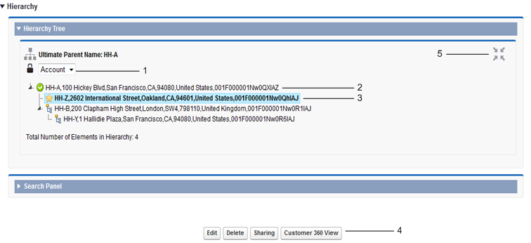 Use the Customer 360 view to get a detailed view of an organization and its subsidiaries. You can view the account hierarchy and the details of records that belong to the account. You can filter the records and alphabetically sort the records. You can search for accounts within a hierarchy. If the master bean of the account is linked to beans from external data sources, you can view the alternate hierarchies.
