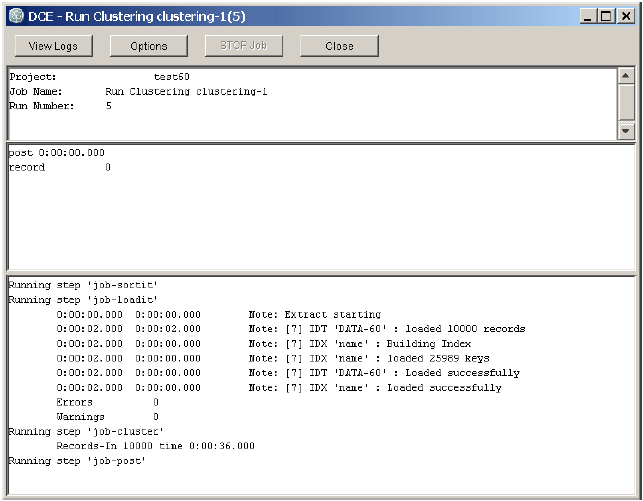 While the clustering process is running, make sure that the Clustering job progress window, such as below, is visible. If it is not visible, double-click the row that contains the details of the Clustering job in the Launched Jobs panel in the main console window.