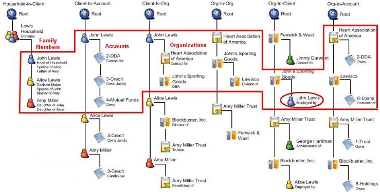 you can do the sorting, filtering, and managing that results in this kind of easily accessed, comprehensive data arrangement. From the new data arrangement John Lewis’ relationships are more clearly discerned. These relationships are enclosed within the red line and are summarized in red type in the figure above. John has a relationship with his wife (Alice) and his daughter (Amy Miller). He has three types of accounts: DDA, credit card, and mutual fund. He is associated with two organizations: Heart Association of America, and John’s Sporting Goods, where he is also employed.