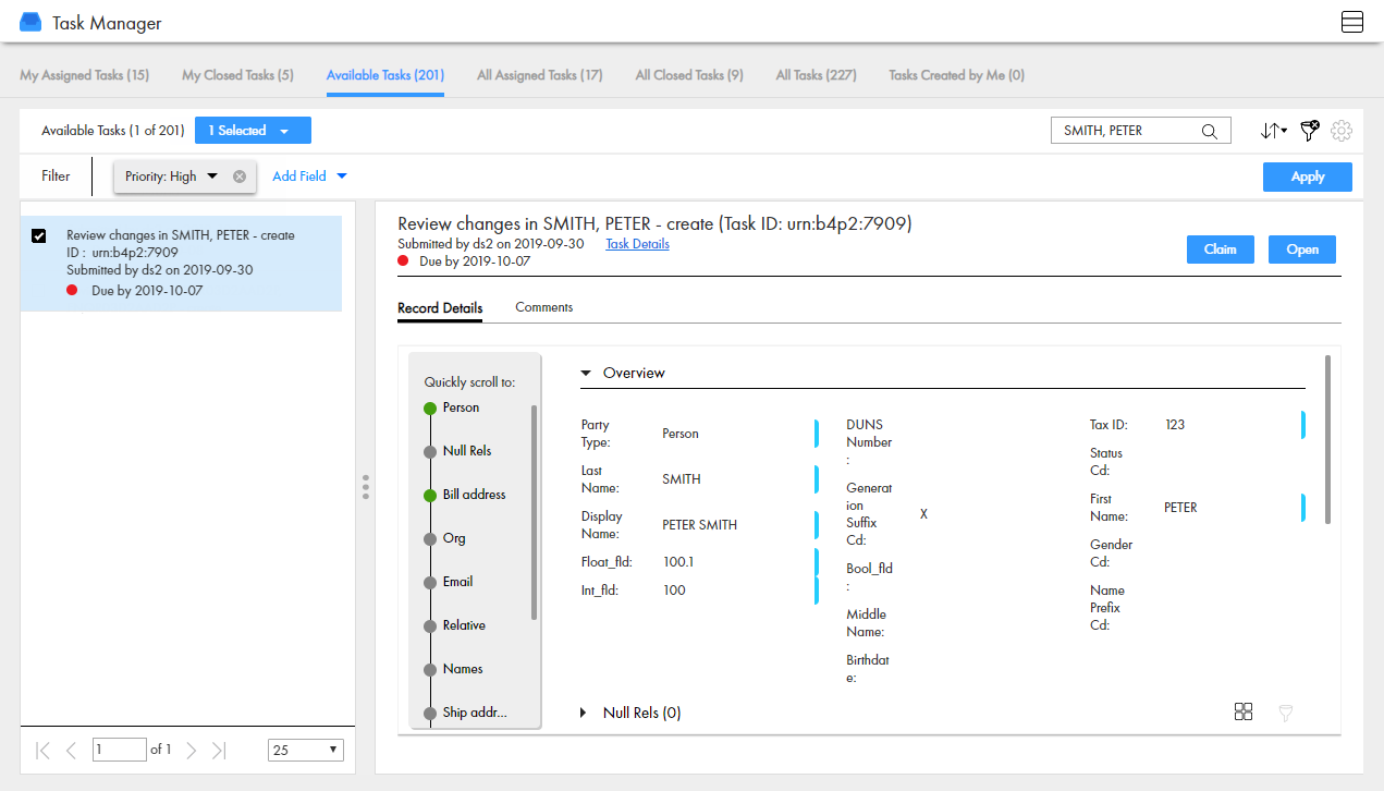 For example, you might want to find high priority tasks related to the Peter Smith record. To find these tasks, you might use the