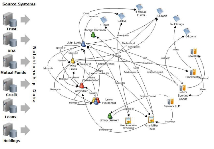 In the following scenario, the Lewis family has many different kinds of relationships with many different kinds of individuals and other types of entities, such as trusts. The information is housed in six source systems. The following figure depicts the discoverable relationships within the information.