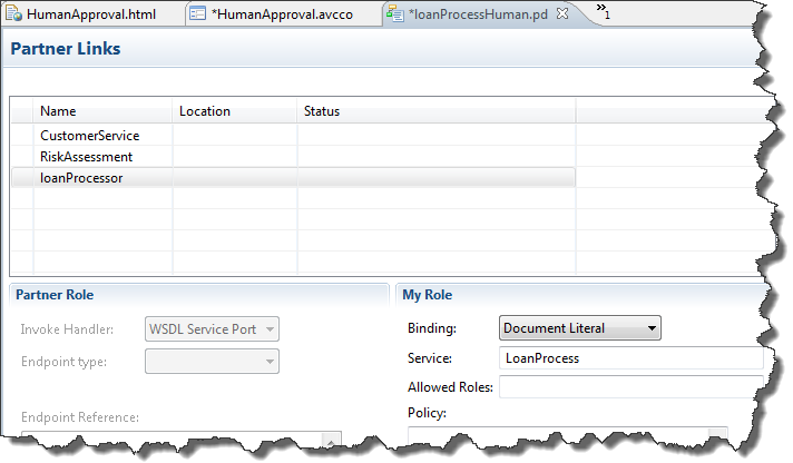 Next set the runtime binding information for the LoanProcess partner link by selecting the LoanProcess row and setting the following properties: