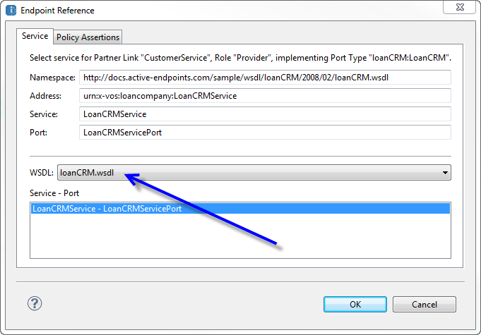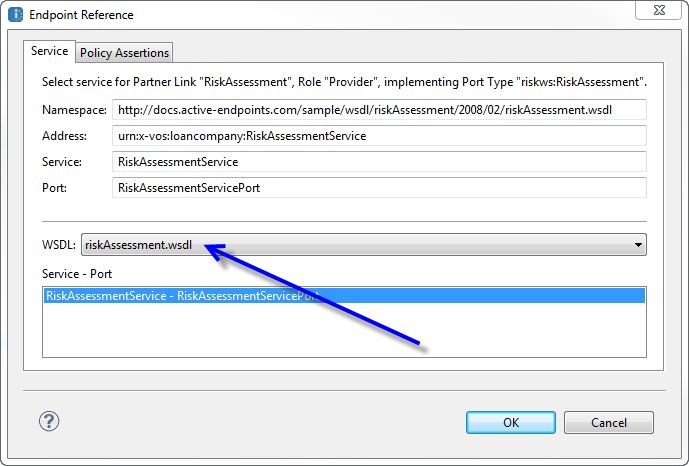 Set the runtime binding information for the RiskAssessment partner link by selecting the RiskAssessment row and set the following properties: